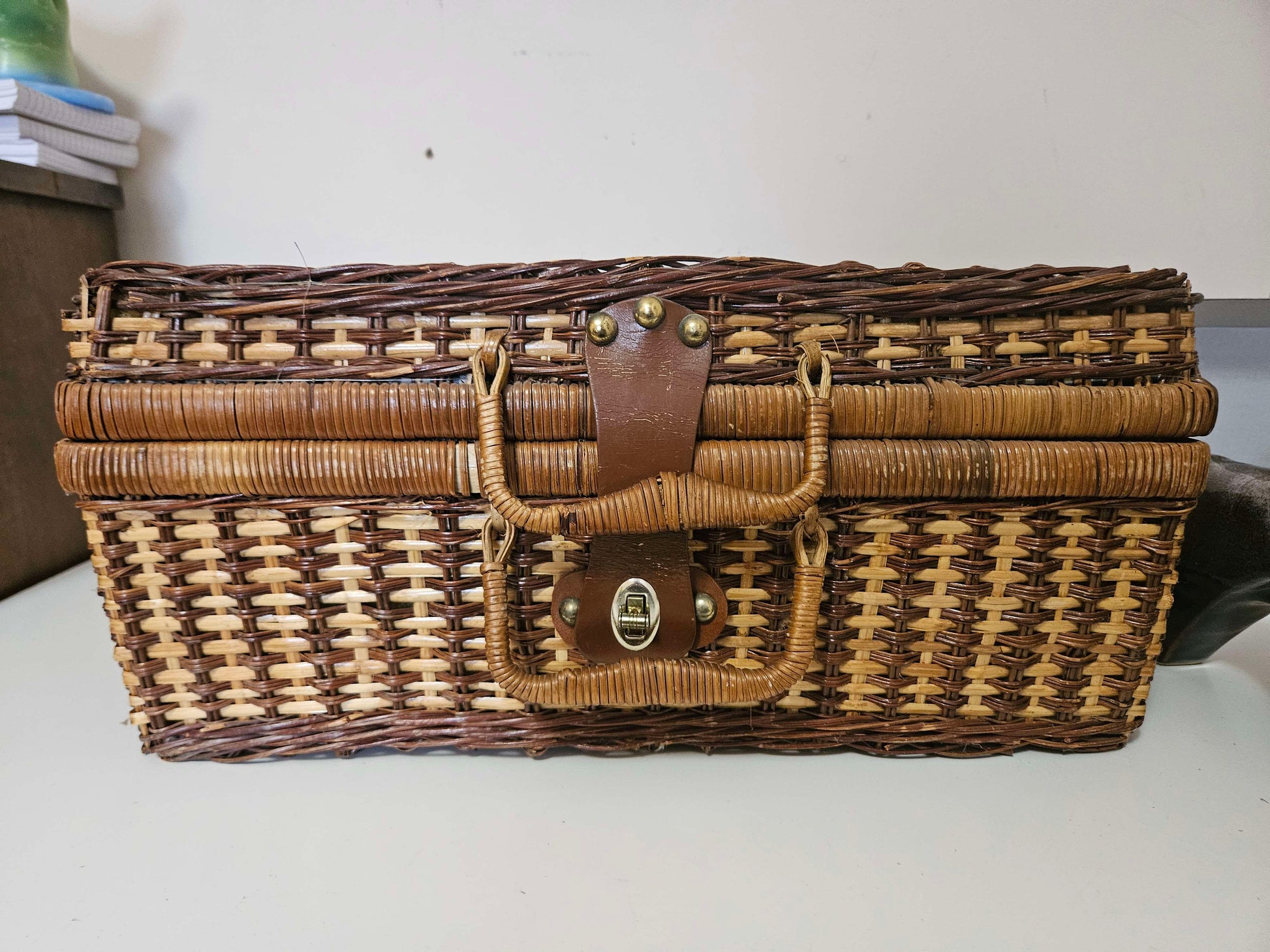 Wicker basket woven with dark and blond woods. The latch has a small twist clasp for security and a handle for easy carrying.